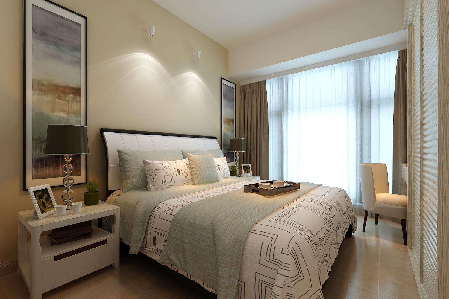 大户型卧室想要有个好的氛围需要注意灯光的点缀,灯光照明的基调应选用温馨和暖的黄色,床头上方可镶嵌筒灯或壁灯,也可在装饰柜中镶嵌筒灯,使室内更具浪漫与舒适。