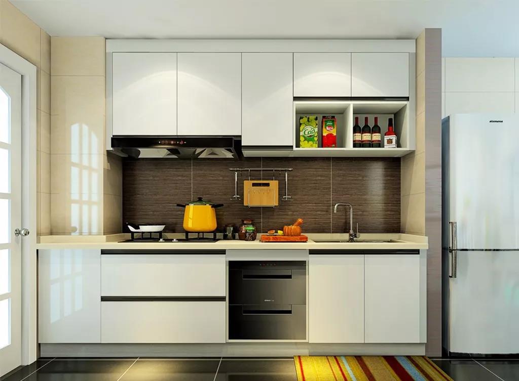 一字型:橱柜、烹饪区、储存区等全部一条线,适合细长型区域的厨房,优点是所有功能分区都在同一直线,简单明了。