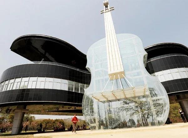 这座建筑的主体是由3根钢柱架空的黑色镜面钢琴,钢琴的上方还设计成掀盖的模样,外观简直就跟真的钢琴如出一辙,里头则是一座2层楼的展览馆。而看似倚靠在钢琴边的透明小提琴,实际上的功能则是门厅及楼梯。