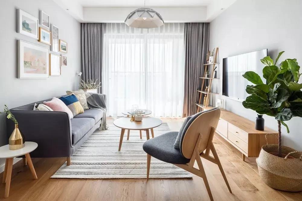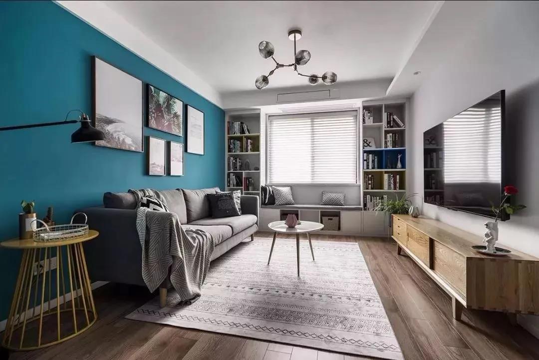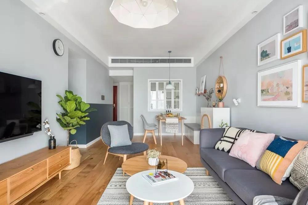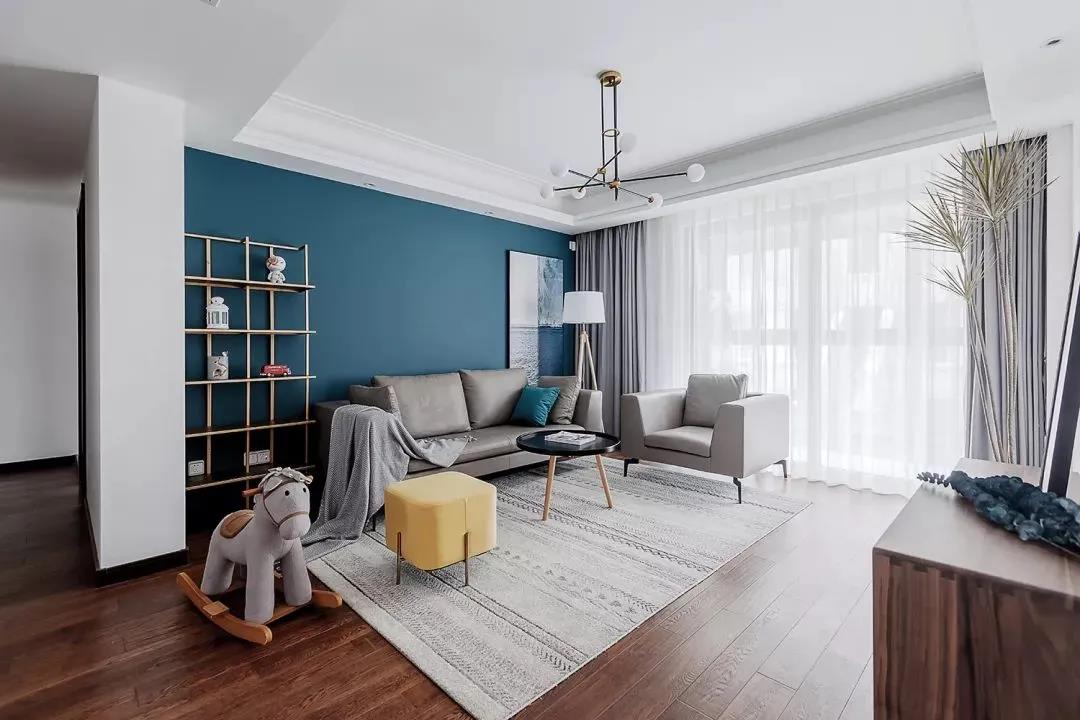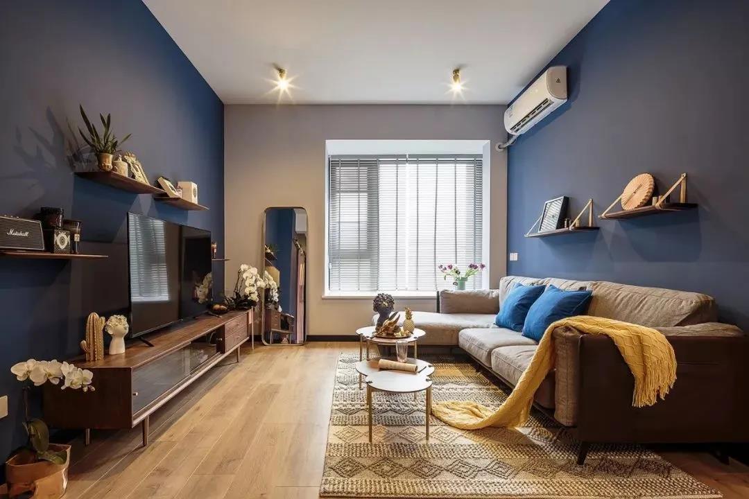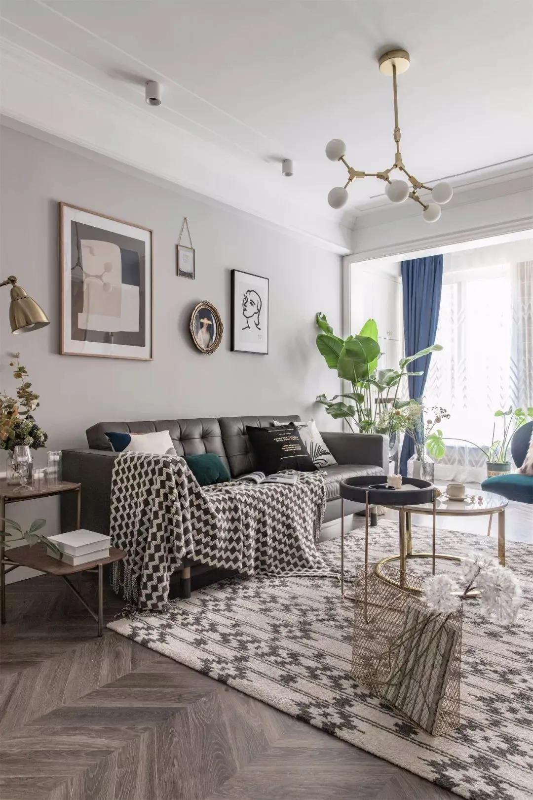 以蓝色、灰色和木色作为基调,搭配绿植和精致的软装,细节处还加入了金属元素,构建出一个清新文艺的家。