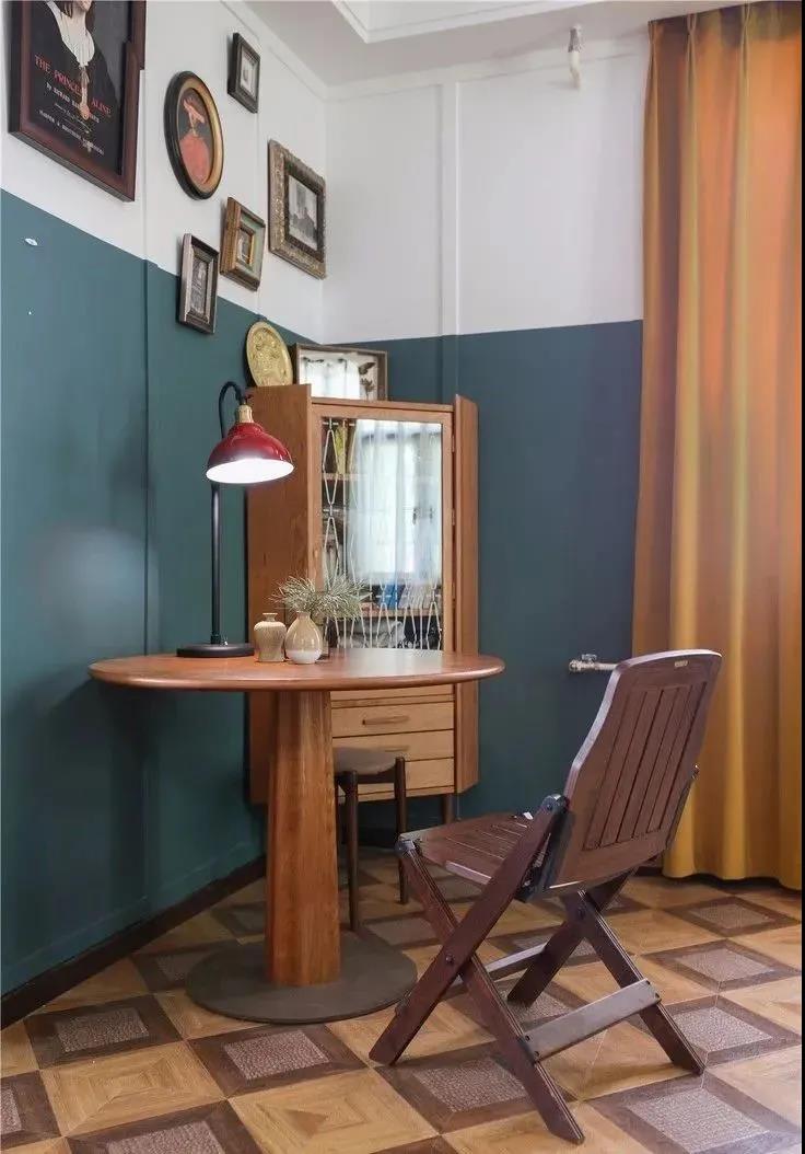 这种半墙并不是80年代的“绿墙裙”,而是“墙面双拼”的刷漆方法,这种刷漆方法利用色彩结合,让空间变得鲜活而灵动,即使不再搭配软装也自成一个完整的风格体系。