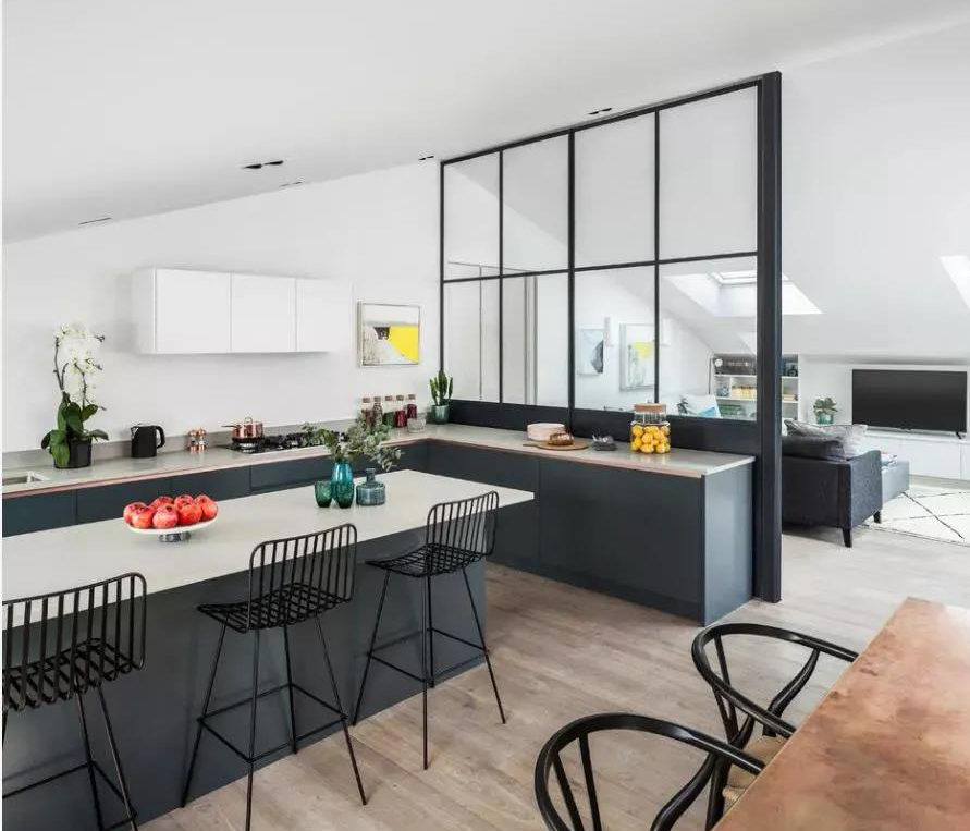还可以考虑在厨房与客餐厅之间做玻璃隔断,让厨房实现开放-封闭灵活操控,平时爆炒的时候关上玻璃,也能够避免油烟溢到客餐厅区域。