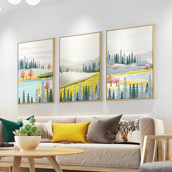 在选择时,沙发背景墙画的总尺寸应该比沙发小30-40cm(左右各往里收15-30cm),可以选择一幅大画,或者2-4幅小画组合;画的中心线在视觉平线的高度上,可以起到很好的装饰效果。(实在搞不清楚,就保持画的中心离地145cm)