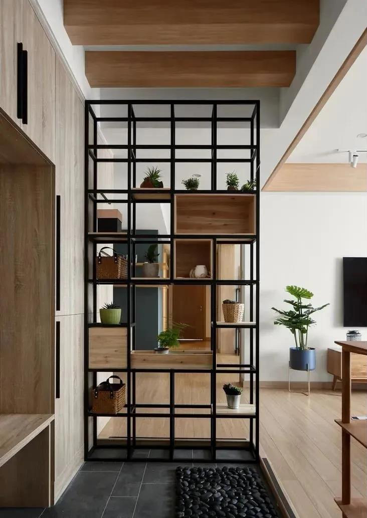 如果入户门到卫生间距离不长,可以考虑木质栅栏隔断和玻璃隔断,都能很好地将玄关区域和家居空间分隔开来。