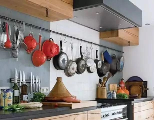 厨房东西多到放不下?那就挂起来吧!只需要一根杆,加S型挂钩若干,就能够挂起大部分的锅碗瓢盆啦!