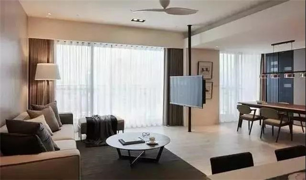 很多时候需要一堵墙用于放电视,但是在小户型里面,一面墙往往就是管线、空间、格局的刽子手,如果不是承重墙,可以采用旋转的方式处理,即维持相对开阔的视野,又有隔断作用,也能在不同角度观赏视频节目。