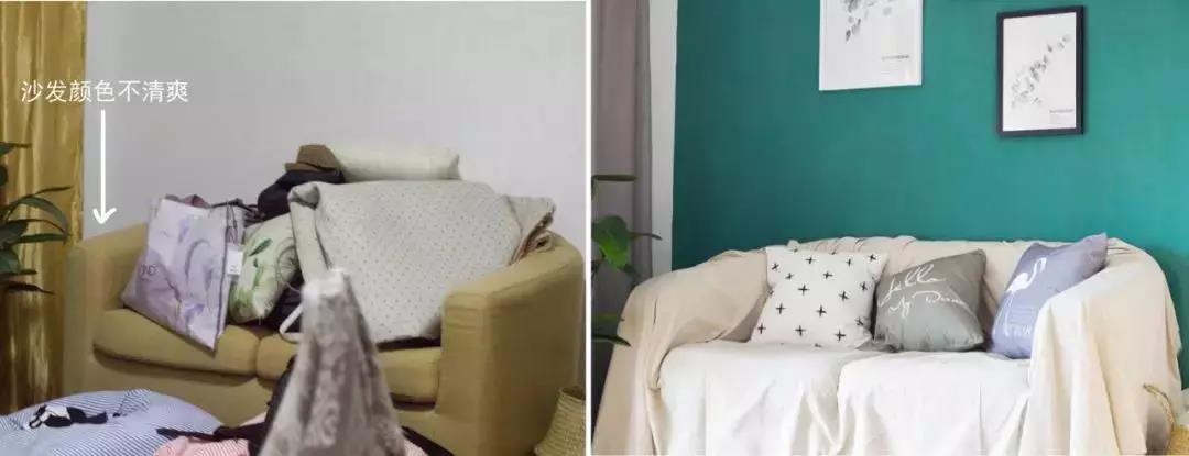 原本丑黄丑黄的沙发,通过一块米色沙发布一遮,瞬间从土黄丑小鸭变成了清爽的白天鹅!