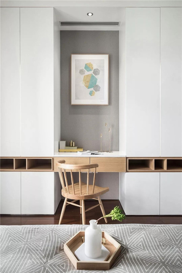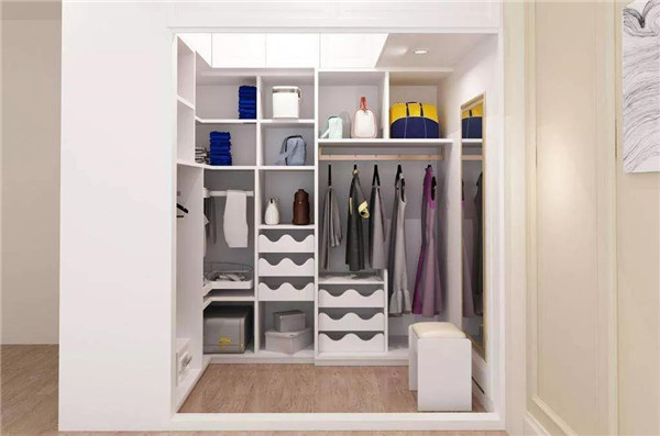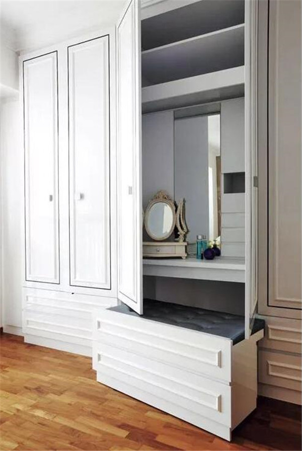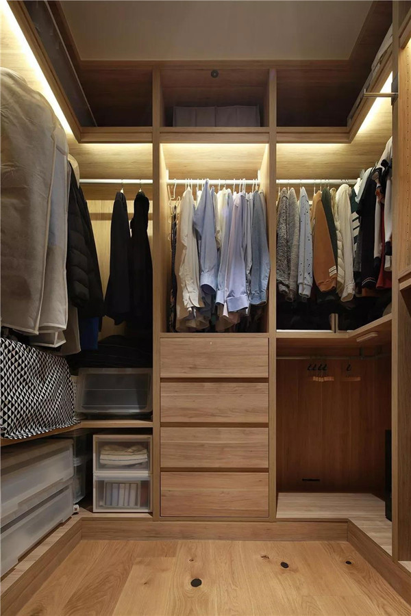 家里条件允许的话可以做一个单独的步入式衣柜(衣帽间),储存空间、活动空间大,换季衣物存放、试衣、化妆都可以在这里进行。