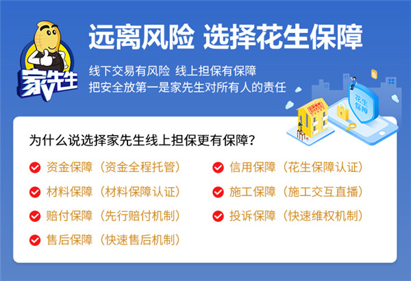 为解决业主的后顾之忧,家先生总部实行包含“资金全程托管、花生保障认证、材料保障认证、施工交互直播、先行赔付机制、快速维权机制、快速售后机制”在内的“花生保障”,以七大免费装修保障,全程提供优质服务。