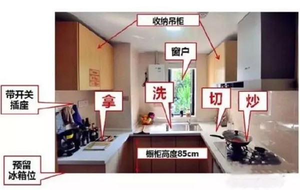 做饭累不累,首先就是考虑厨房的布局和动线,好的烹饪步骤应该是:冰箱拿去食材 → 水槽处理食材→ 台面上切菜准备 → 灶台处炒菜 → 出锅上菜,所有的布局符合操作动线。
