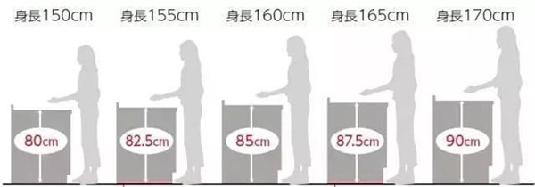 反复试验,最佳尺寸为吊柜厚度一般在300-350mm,离洗手盆台面的高度为700mm。