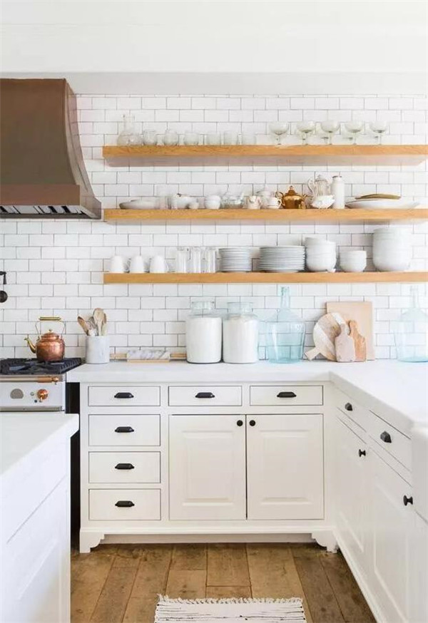 现在很多人提倡把什么东西都藏起来的收纳,好看是好看了,但对于常用的物品来说就非常不实用了,特别是锅里炒着菜还得去打开柜子拿东西的时候,简直想打人,所以厨房还是要适当设计一些开放式的置物柜,拿取非常方便。