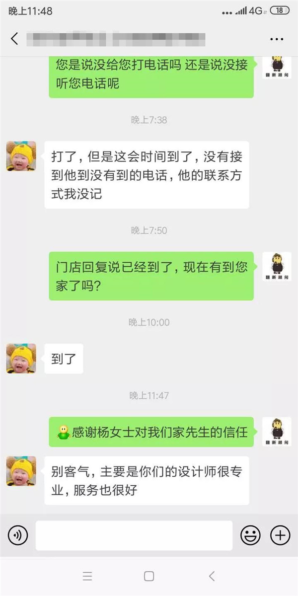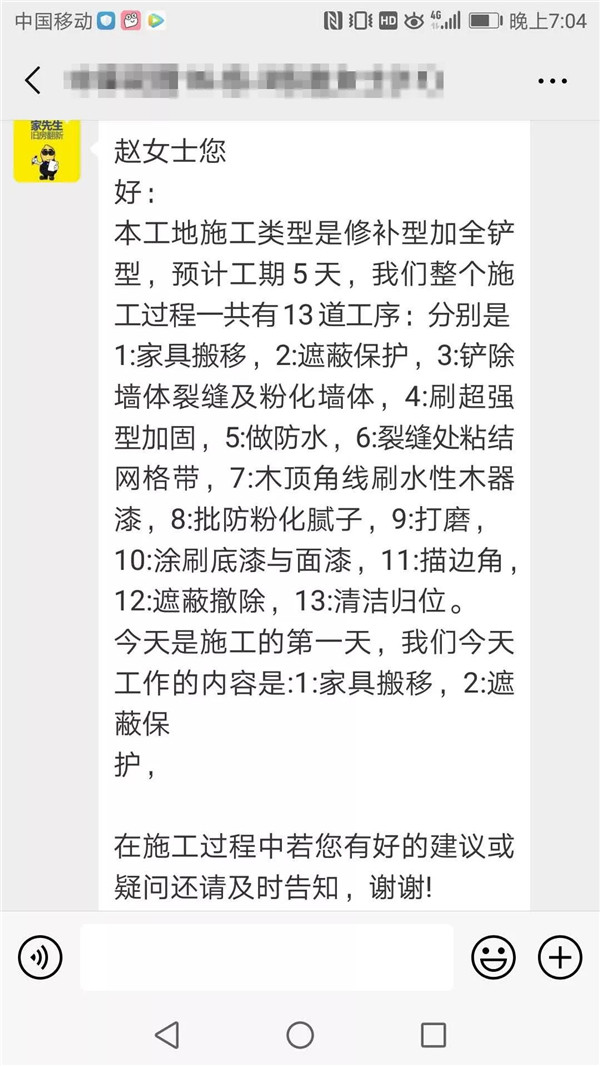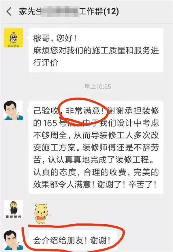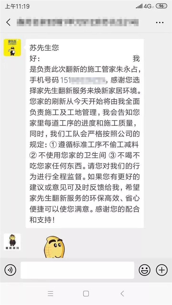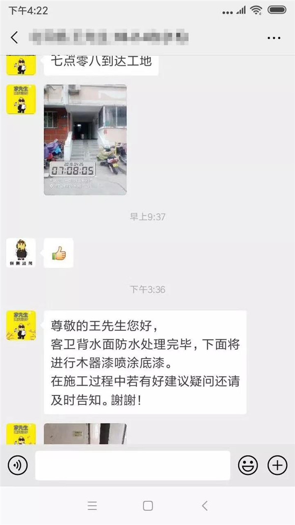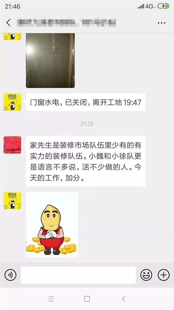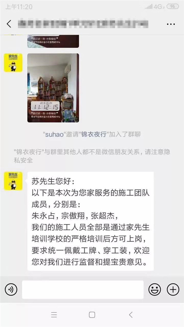 为解决上班族的这一痛点,家先生为每一位业主建立专项VIP微信群,匹配包括门店店主,设计师,施工人员,责任客服等在内的相关工作人员,每日播报施工进度,让业主不用自己盯工地,也能知道工地发生了哪些事情。