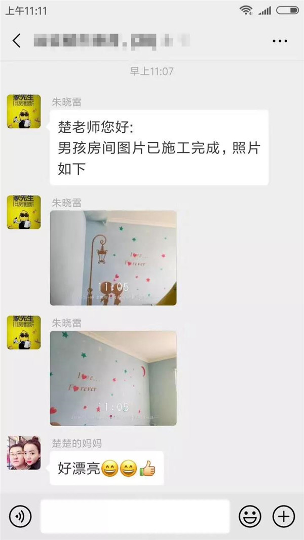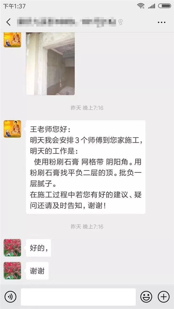 业主随时可以跟工人发起双向语音对讲,有任何问题及时在群里反馈,实时沟通现场情况,我们的工作人员会在第一时间做出回应,避免工人施工失误带来的损失,工期如期完工,装修效果有保障。