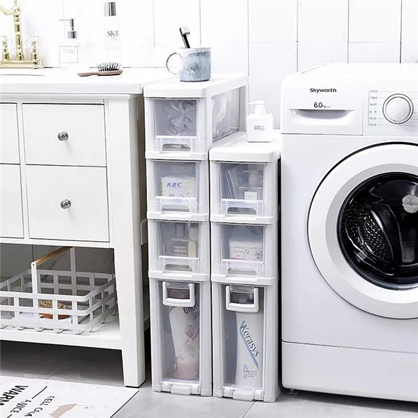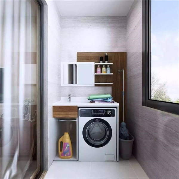 最常见的做法就是利用洗衣机上方空间,收纳洗衣液或者脏衣篮。此外,如果还考虑整洁,不妨再配上一块帘布,既实用又美观。