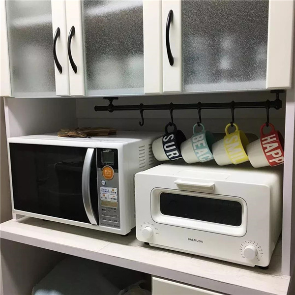 如果你家里有烤箱、微波炉,请注意了,上方空间不可以浪费掉哦!用一个吸盘挂架,固定在上面的隔板上,挂钩上可以挂杯子。吸盘式挂架不用在墙上打洞,能保证墙面光滑整洁。