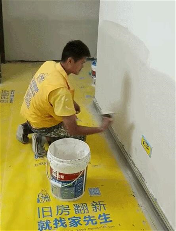如果墙壁面上存在裂缝和电路凹槽,家先生师傅会先用牛皮纸加白乳胶贴住,然后使用腻子进行一次批灰,将墙面涂抹平整,保持墙面整体性。