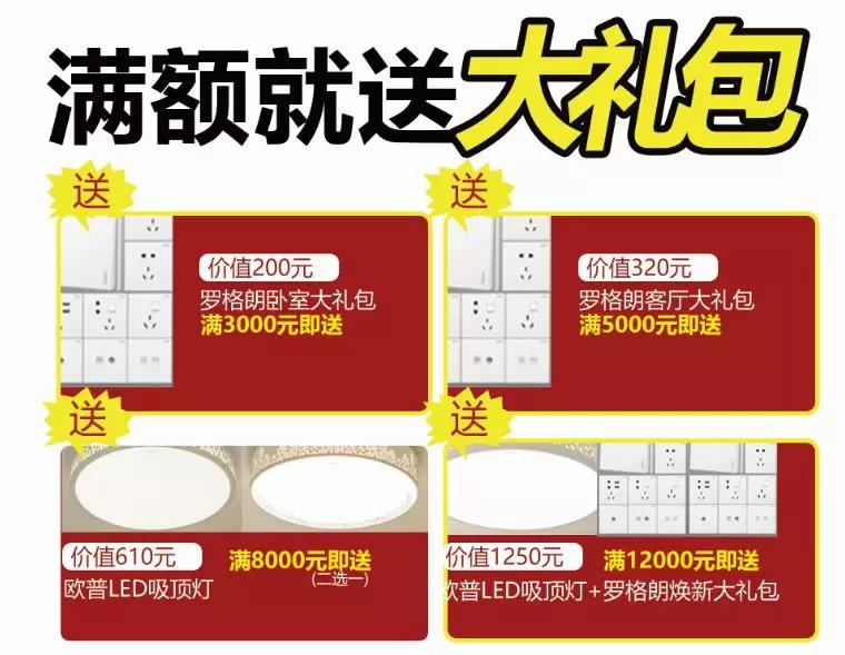 订单满12000元赠送欧普LED吸顶灯+罗格朗卧室客厅大礼包