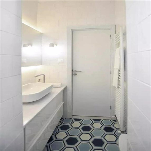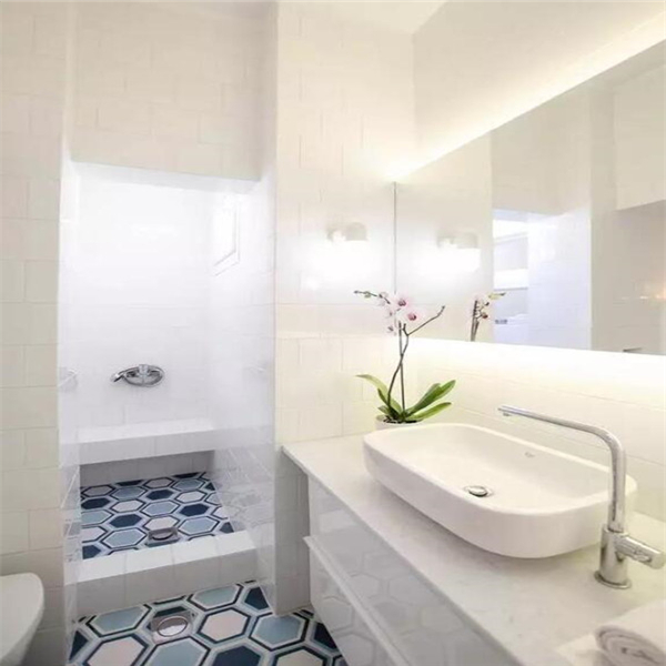 墙面采用了白色瓷砖的设计,地砖采用了蓝色拼接花砖,白和蓝的色调搭配,简洁明亮。