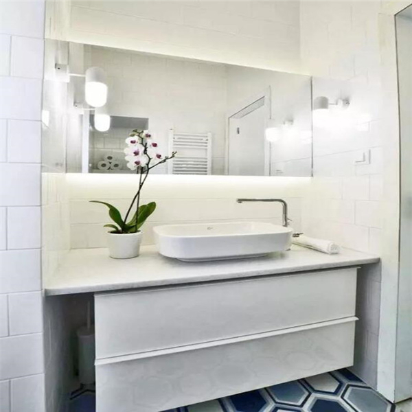 使用了一整面造型的镜子,增加了空间感,新的洗手台下方设计了橱柜,增加了收纳空间。