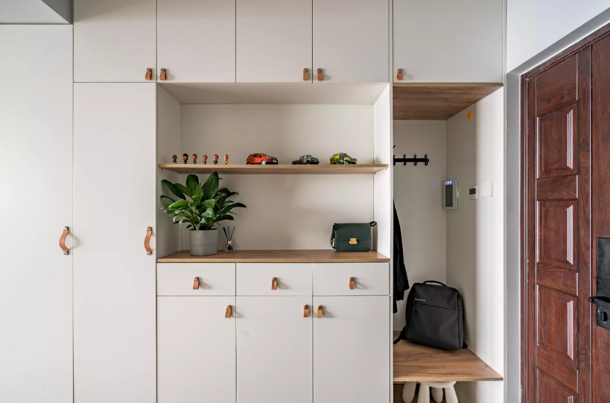 右侧带有换鞋凳,挂衣架等,左侧则设计了隔板展示柜,用来摆放小摆件。