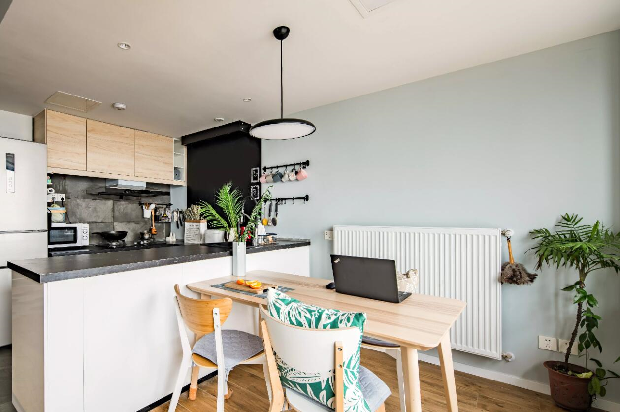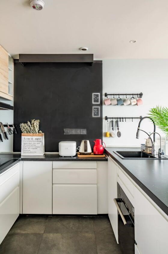 开放式的厨房设计了U型的台面,并且做了许多的橱柜收纳,比较实用。