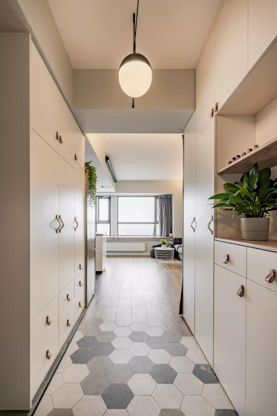 两侧大面积的顶天立地式玄关柜,提供了强大的收纳空间。