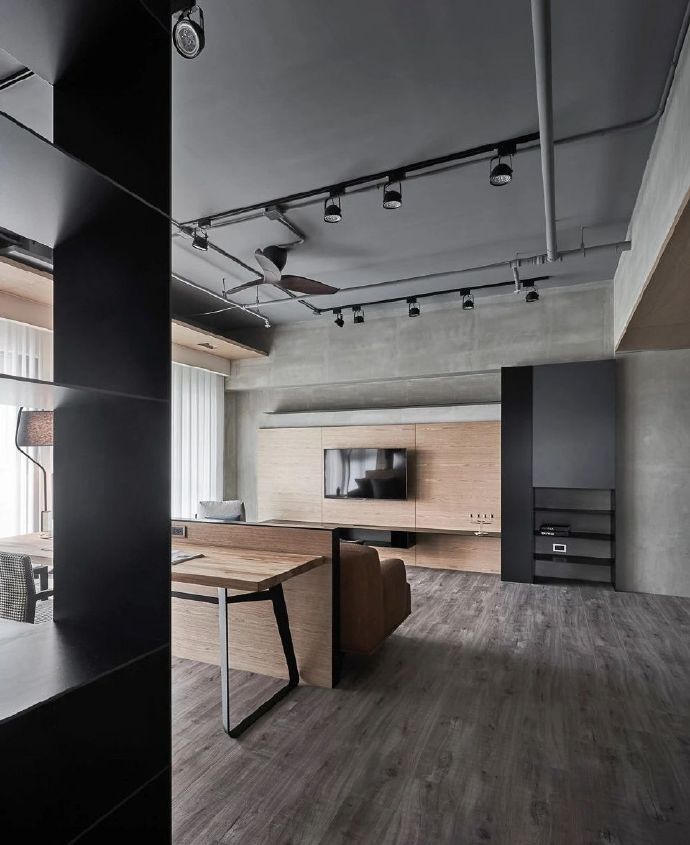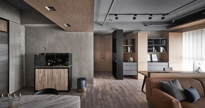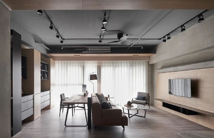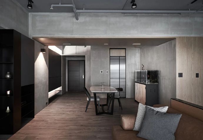 110平现代混搭工业风三居室装修案例效果图。