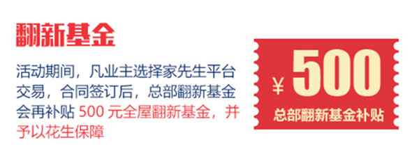 活动期间,凡业主选择家先生平台交易,合同签订后,总部翻新基金再补贴200元墙面翻新基金/300元局部翻新基金/500元全屋翻新基金,并予以花生保障。