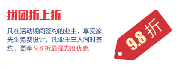 凡在活动期间签约业主,即享家先生免费设计;三人同行签约,更有9.8折最强优惠!