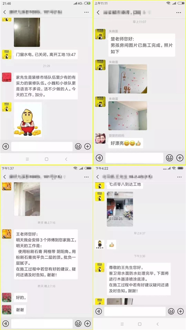 家先生施工工地从开工到竣工验收阶段,均有专项微信群为客户全程播报施工进度,无须亲自到场,亦可随时随地了解施工过程。