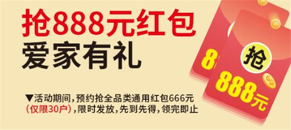 活动期间,预约抢翻新通用红包888元,限时发放,领完即止(仅限30户)。