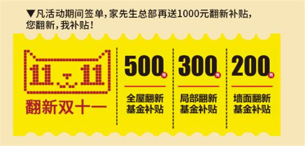 凡活动期间签单,家先生总部再送1000元翻新补贴,您翻新,我补贴!