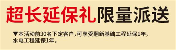 本活动前30名下定客户,可享受翻新基础工程延保1年,水电工程延保1年。