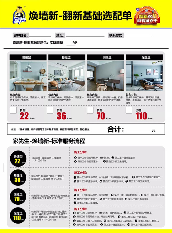 家先生所有套餐均采用标准报价、标准工艺、标准材料,无隐形消费。