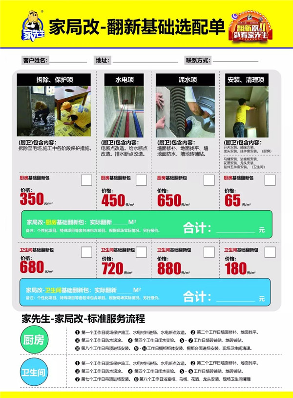旧房翻新全国连锁品牌家先生,经过多方市场调研推出了【家局改】“翻新火锅报价单”,让做翻新预算像吃火锅一样简单,不会看报价的业主再也不用担心被坑了!