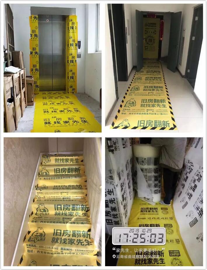 从电梯口开始就要做好成品保护 ,用保护膜对电梯和楼道进行保护,防止运送材料时磕碰或是损坏,这样避免影响邻居的使用或是维修带来的经济损失。