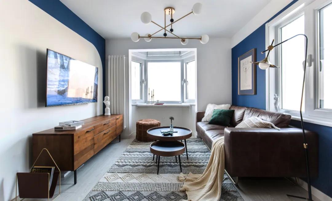 客餐厅位于同一空间内,共用一面蓝色墙,增强区域的连续和统一;客厅地面铺了地毯,又形成了二者的区分。