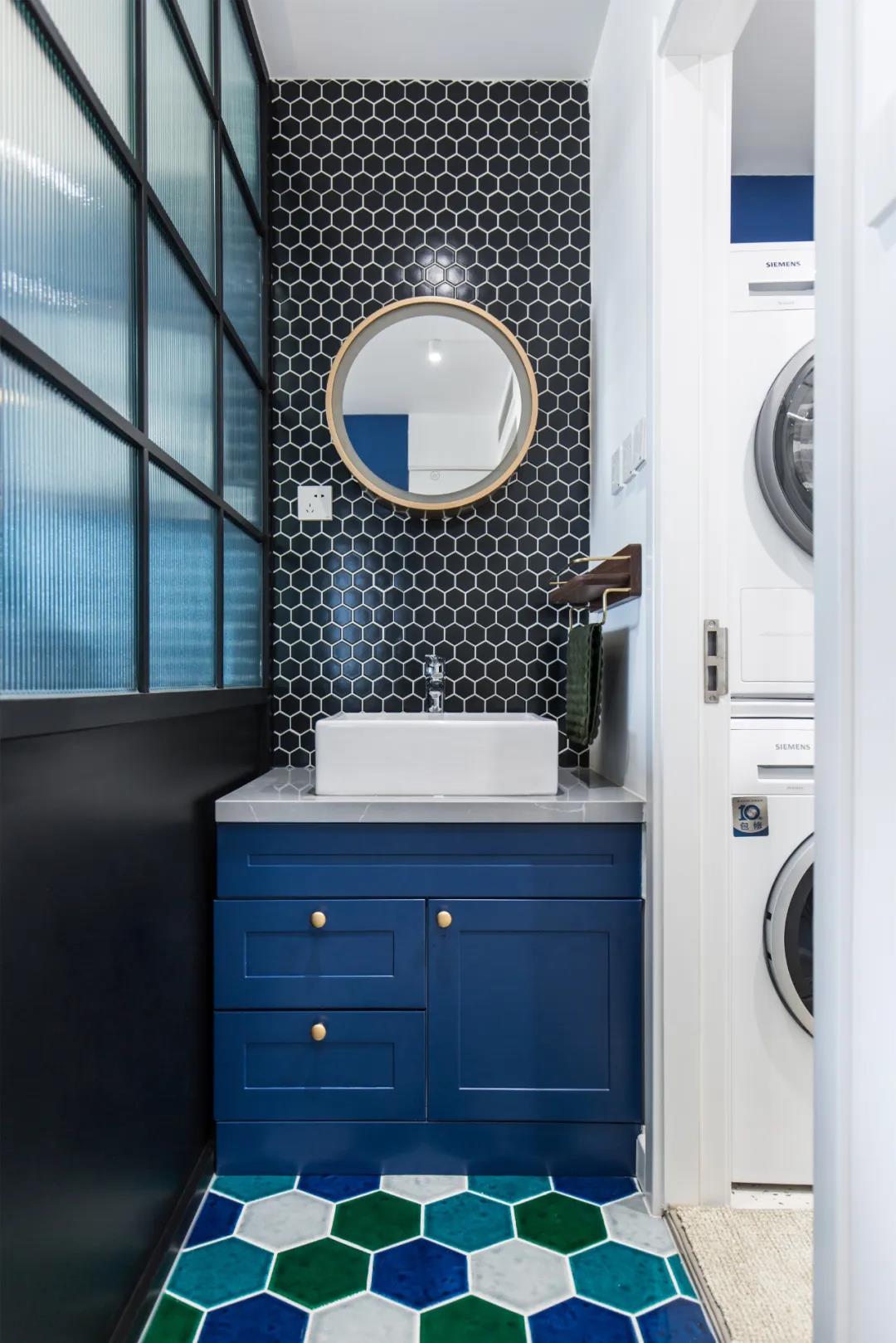 将洗手台外置,小小的卫生间实现了干湿分离,长虹玻璃隔断不影响采光,同时保障私密性。