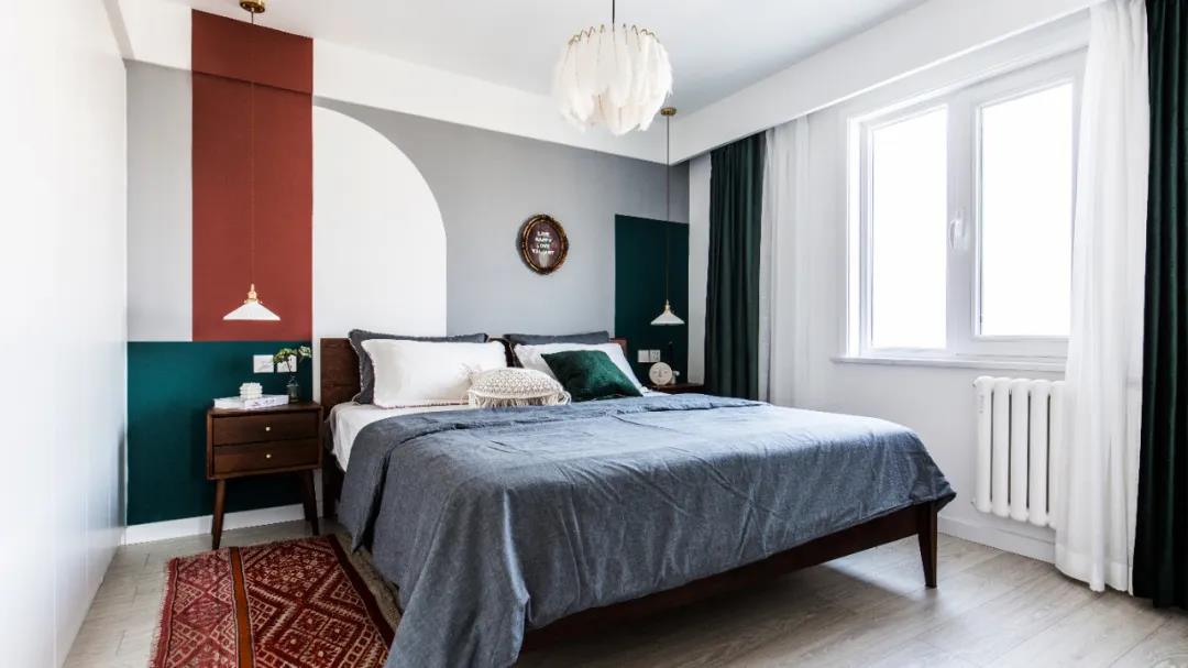 主卧色系以白色为主,并融入了深红、墨绿等小面积色块,延续复古主题。