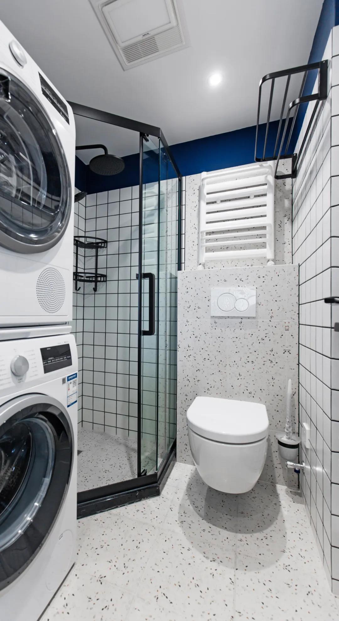 洗手间内部采用了仿水磨石的地砖,放了洗衣机和烘干机。壁挂式马桶更显简洁,上方台面可顺势用来收纳。