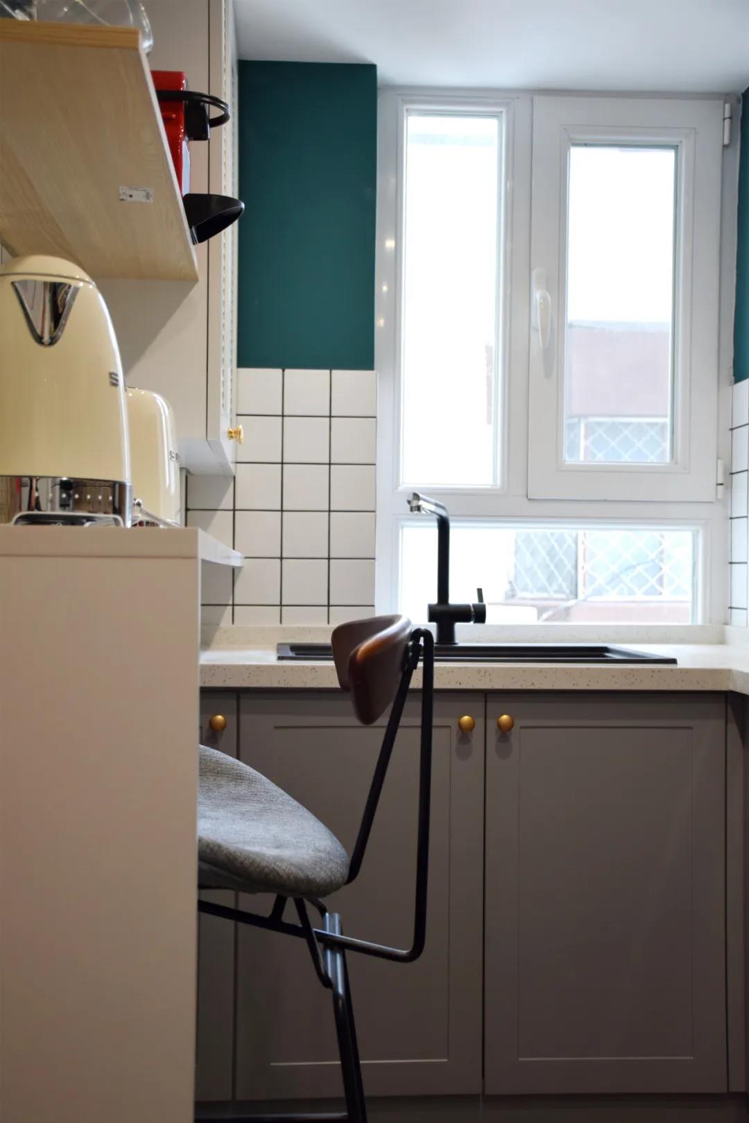 仿红砖的半墙、复古红的小电器,与上半部分的绿色半墙形成撞色,整个厨房采用了大量复古元素。