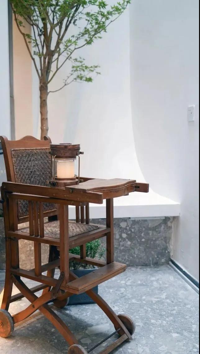 茶几是用老房子的楼梯扶手制作而成,墙裙是用老房子拆下来的废旧板材,还有角落随意摆放的老物件,延续了老建筑的灵魂