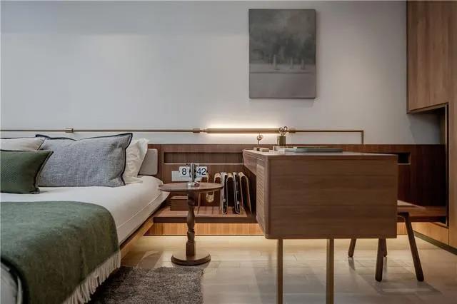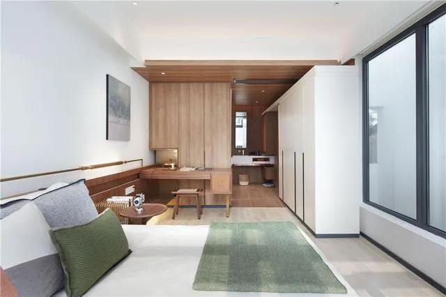 实木柜体组成的墙壁还隐藏了一张双人大床,折叠玻璃门关闭后就成为了一个可以供客人休息的独立套间。