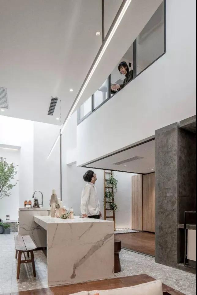 走进室内,从天井倾泻而下自然光线流入每一个空间,错层的设计让空间与空间形成缝隙,令空间与空间之间的互动更明显,让人与人、人与“家”更亲密。
