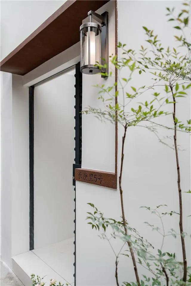 新式趟拢门、老宅门前的旧石头、门前的盆栽绿植,布景清幽雅致。