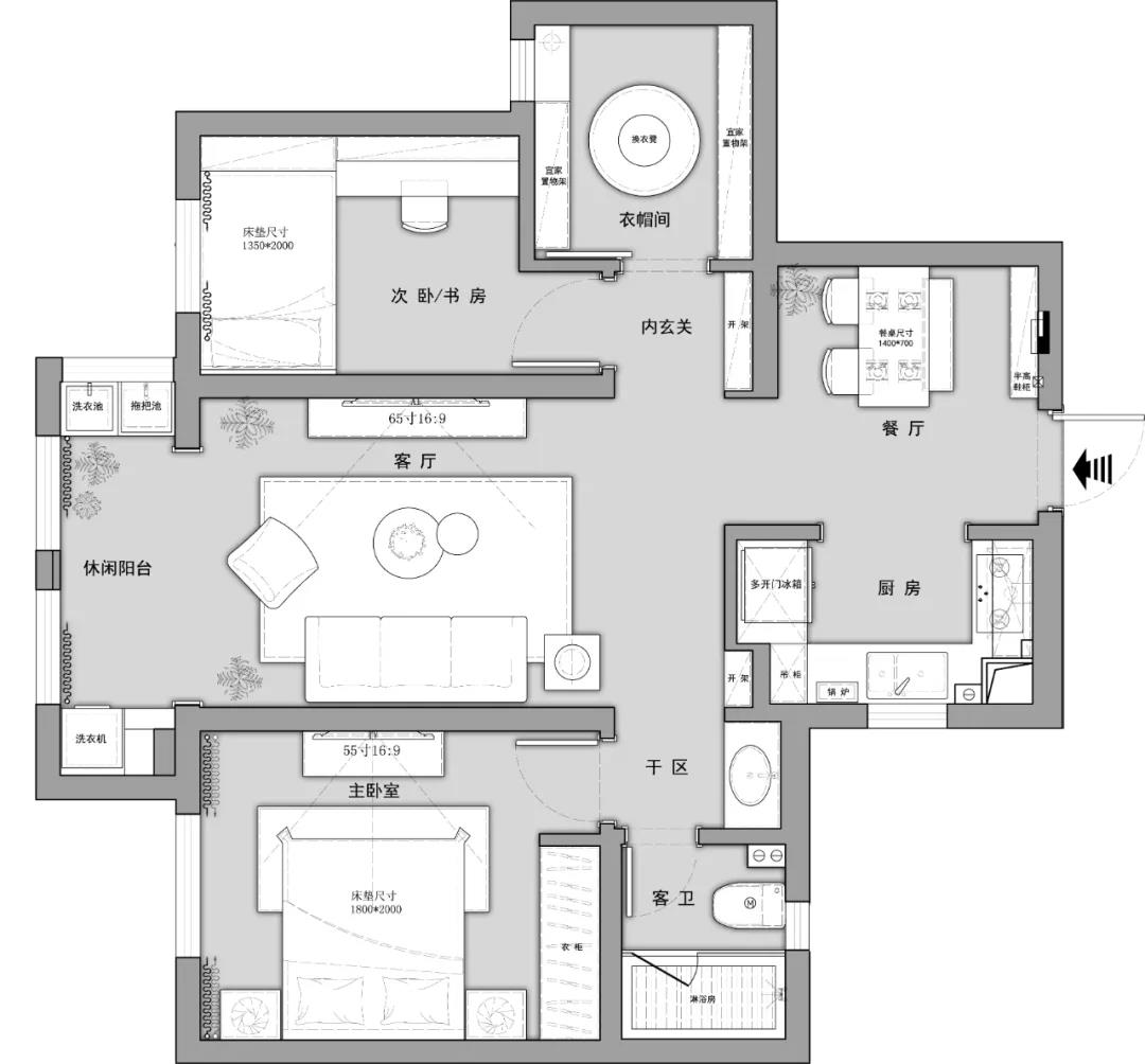 ● 格局不做大的调整,将次卧和小房间打通,增加小房间的采光,小房间改为衣帽间。