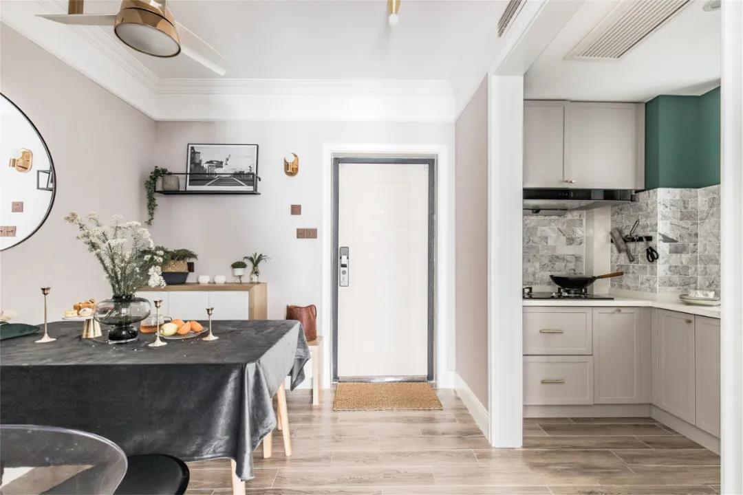 餐厅的地板砖延伸到厨房,在视觉上放大空间