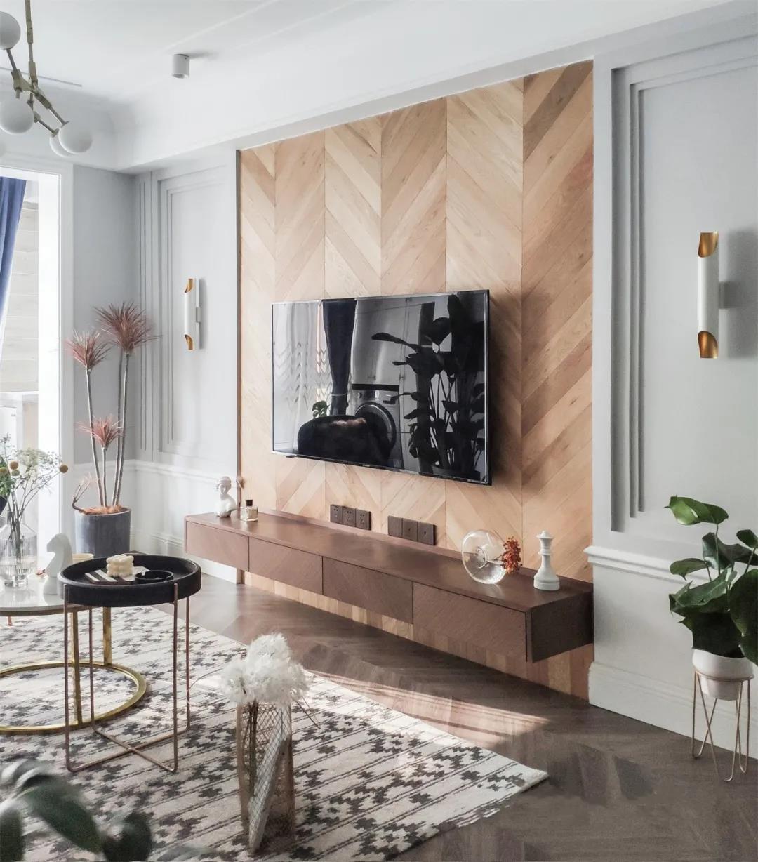 鱼骨地板的墙面铺贴及石膏板护墙的交迭运用