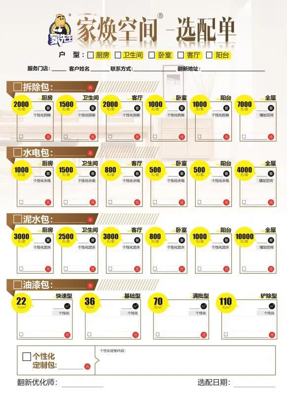 家先生业内独有“火锅配置单”,涵盖全屋翻新、局部改造、墙面刷新等旧房翻新中的各个场景,操作便捷,只要勾选你需要的项目进行组合,不仅拥有更多的主动权,还能实现心中笔笔有数,无论你想怎么翻新都可以!